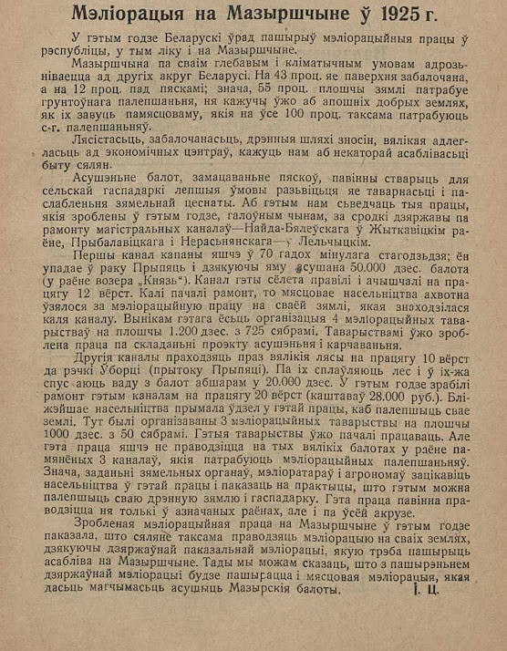 Зробленая мэліорацыйная праца на Мазыршчыне ў гэтым годзе наказала, што сяляне таксама праводзяць мэліорацыю на сваіх землях, дзякуючы дзяржаўнай паказальнай мэліорацыі, якую трэба пашырыць асабліва на Мазыршчыне. Тады мы можам сказаць, што з пашырэньнем дзяржаўнай мэліорацыі будзе пашырацца і мясцовая мэліорацыя, якая дасьць магчымасьць асушыць Мазырскія балоты.